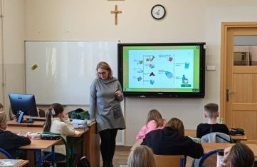 Pełnowymiarowa sala gimnastyczna, wszystkie sale lekcyjne wyposażone w tablice i monitory interaktywne