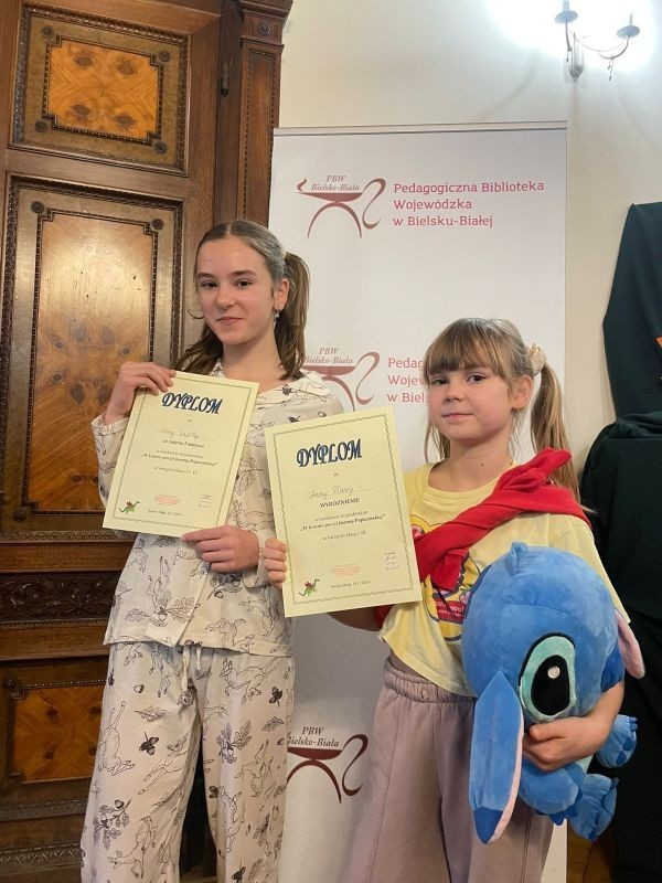We wtorek, 25 listopada 2025, dwie uczennice naszej szkoły wzięły udział w międzyszkolnym konkursie recytatorskim „W krainie poezji Joanny Papuzińskiej”, który został zorganizowany przez Pedagogiczną Bibliotekę Wojewódzką w Bielsku-Białej. Ich interpretacje wierszy zdobyły uznanie komisji, a obie uczennice zostały nagrodzone.