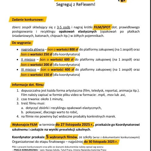 KROK 2. – zbierz grupę 3-5 osób, która przygotuje plakat (kl. 1-3) lub filmik (kl. 4-8), zachęcający do zbierania i recyklingu opakowań elastycznych (w żółtych pojemnikach).
