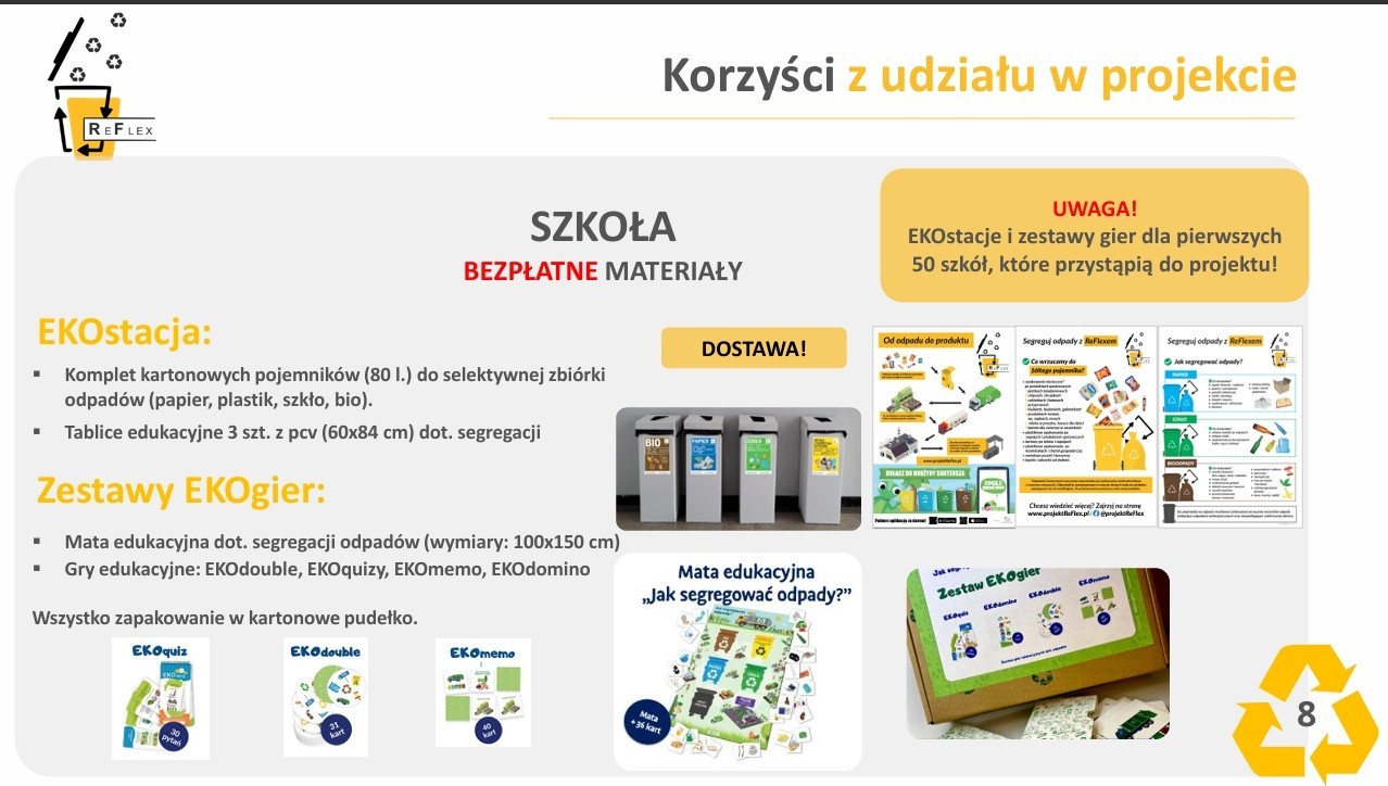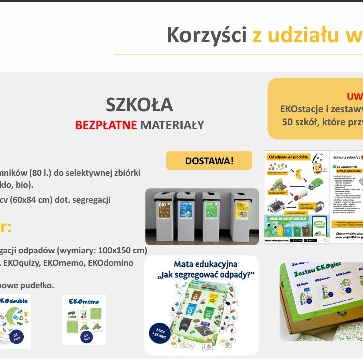 W ramach projektu uczniowie mają dostęp do bezpłatnych materiałów edukacyjnych a nasza szkoła otrzyma EKOstacje (pojemniki do segregacji odpadów wraz z tablicami edukacyjnymi oraz zestaw EKOgier).
